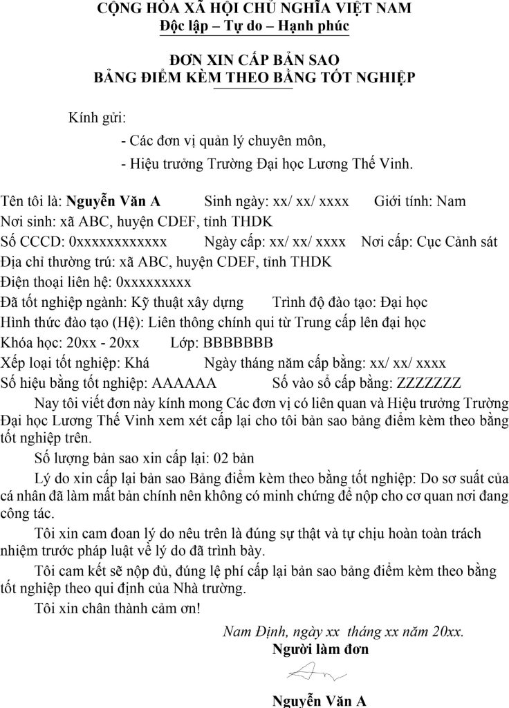 Đơn xin cấp bản sao bằng tốt nghiệp (theo mẫu của trường).